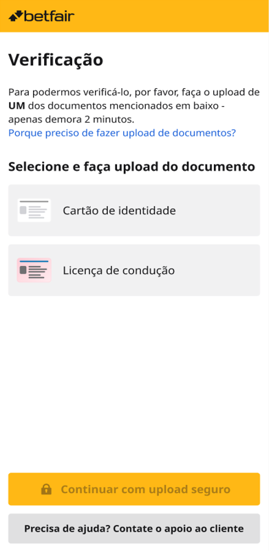 Uma vez que a verificação for concluída (processo que dura cerca de 2 minutos), você receberá um e-mail informando, e poderá continuar a jogar na Betfair normalmente. Se você encontrar algum problema, utilize o recurso "Entre em Contato" abaixo para falar com um de nossos agentes de atendimento ao cliente.