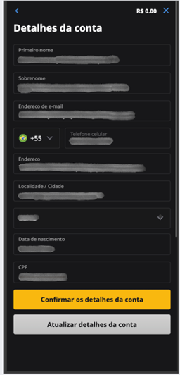 Os dados pessoais que você precisará revisar são: nome, sobrenome, endereço de e-mail, número de telefone e endereço residencial. Você pode corrigir esses campos de forma rápida e simples. Sua data de nascimento e número de CPF também serão exibidos, mas não poderão ser alterados diretamente. No entanto, se precisar corrigir algum desses dados, entre em contato com nossa equipe de Atendimento ao Cliente para obter assistência.