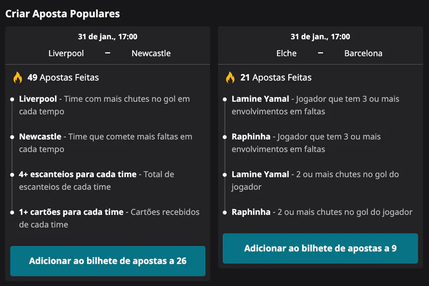 Além disso, na própria página do jogo em questão há uma aba do Criar Aposta, na qual destacamos automaticamente as Mais Populares. Confira abaixo: