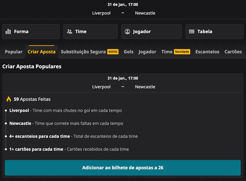 Nem todos os nossos mercados estão atualmente disponíveis para uso no Criar Aposta. Por isso, na página de cada jogo, há uma aba com o próprio nome de Criar Aposta, listando apenas o que está disponível.