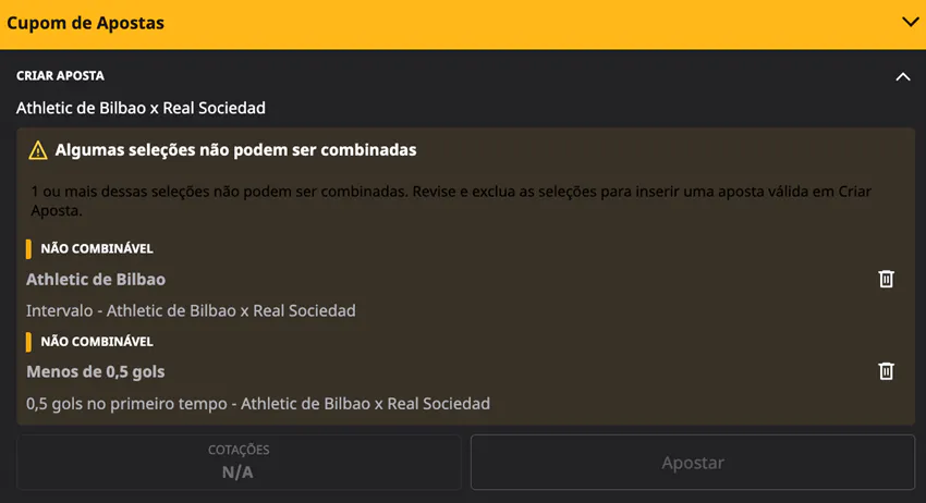 Como foi selecionado "Menos de 0,5 gols" para o 1º tempo, não é possível que qualquer uma das equipes esteja vencendo no Intervalo do jogo. Portanto, você recebe um aviso de que os mercados em si não podem ser combinados.