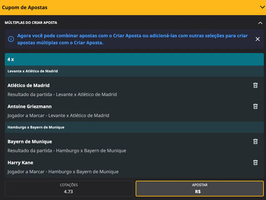 Sim, o Criar Aposta pode ser combinado com seleções de qualquer outro evento ou esporte, desde que sejam elegíveis para serem colocadas como múltiplas entre si. Confira no exemplo abaixo, com seleções de dois jogos e o aviso que aparece na tela: